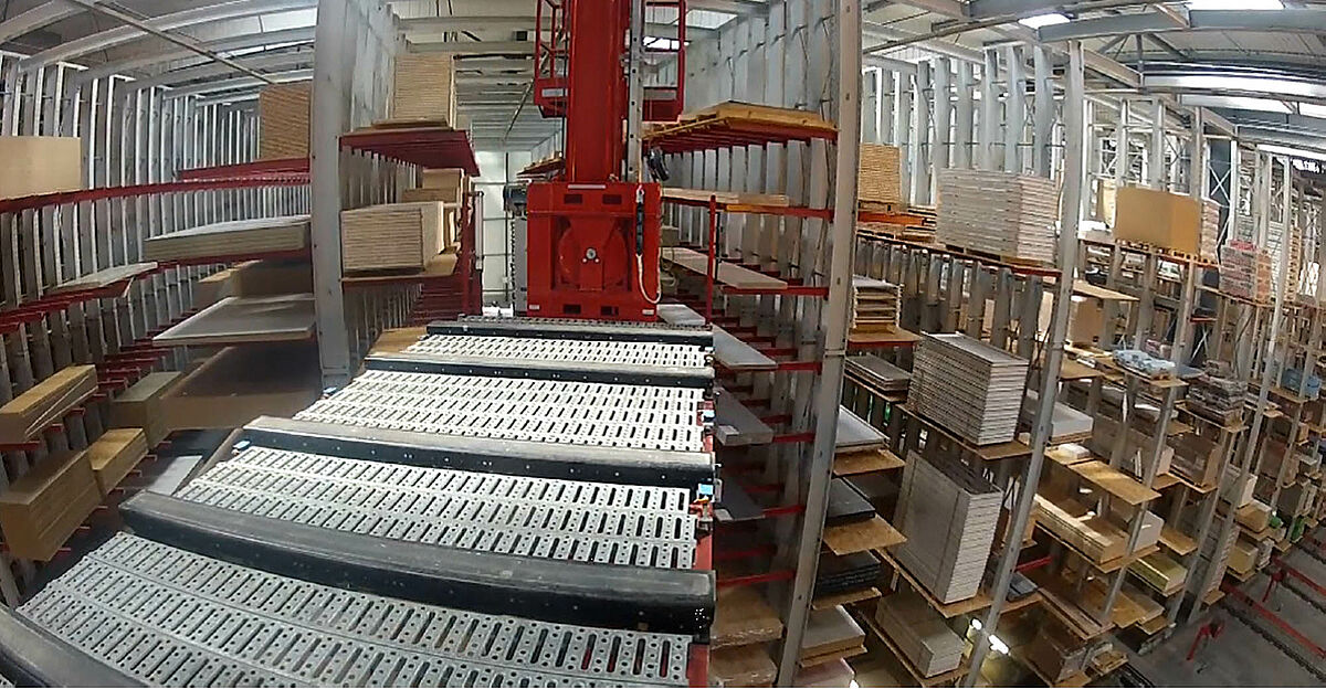 Az 1. zónában egy teljesen automatizált, polcokat kiszolgáló eszköz végzi az akár 5,1 méter hosszú és akár 5 tonna súlyú forgácslapcsomagok és raklapos laminált padlók be- és kiraktározását. A kanyarjáratos RBG eközben ennek a raktárterületnek mind a három járatát kiszolgálja. Az áruk vagy ügyfélmegbízásból vagy feldolgozási célból kerülnek a kiraktározásra a saját szabászati egységből. Láncos és görgős szalagokra kerülnek az áruk az RGB-ről, ezek szállítják az árukat a megfelelő munkaállomásra.