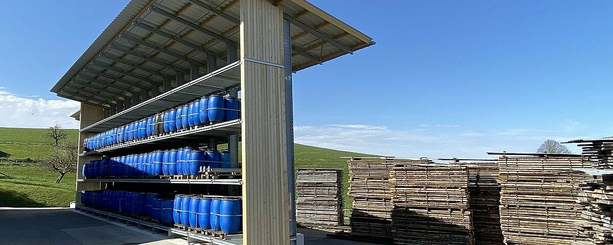 A meredek lejtésű terep és a szűkös helyviszonyok különleges követelményeket támasztottak a Nyfeler Holzwaren AG asztalosvállalat számára készülő új, kültéri raktárrendszer tervezési szakaszában. Az OHRA a kétoldalas karos állványokat végül keleti és nyugati oldalra osztotta, amelyet az eltérő padlómagasság és az egymáshoz képest eltolt kialakítás ellenére egy közös, hat méteres tető véd. A Nyfeler az állvánnyal jelentősebb több tárolófelületet nyert, időt takarít meg a be- és kirakodáskor és a tárolt áruk esetén kevesebb a sérülés az időjárási hatások elleni védelemnek köszönhetően.