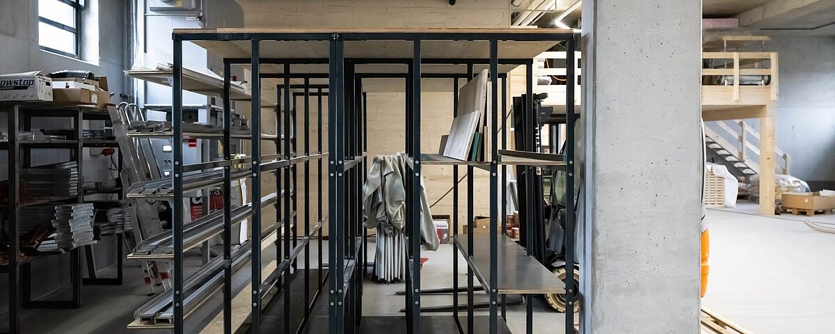 Az új raktár külső része közel 16 méter hosszú, tűzihorganyzott, karos állványrendszert kapott. A belső térben egy 15 méter hosszú és egy három méter hosszú karos állvány helyezkedik el. A körülbelül hét méter magas karos állványok lényegesen nagyobb tárolókapacitást biztosítanak, a padlós tároláshoz és a régi telephely lényegesen alacsonyabb karos állványaihoz képest. A 1000 kg teherbírású karos állványok egy része rácsozott szinteket és karhidakat kapott. Ez lehetővé tette fűrészáruk, bizományos tételek és raklapos áruk széles választékának elhelyezését az állványokon. Ezenkívül az egyes tárolószintek magassága nagyon rugalmasan állítható a szabadon befüggesztett karokkal. A különféle méretű lapanyagok tárolására két függőleges polcot is kialakítottak, amelyekben a lapok állva tárolhatók – így a kívánt lap gyorsan és könnyen elérhető. Az összes belső állvány és polc az „Ihre Zimmerei” kérésére vonzó antracitszürke (RAL 7016) színű szinterezett bevonatot kapott.